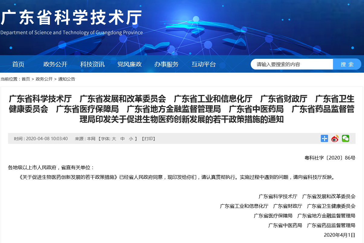 2020年4月8日,廣東省科學技術廳、廣東省發(fā)展和改革委員會、廣東省工業(yè)和信息化廳、廣東省財政廳、廣東省衛(wèi)生健康委員會、廣東省醫(yī)療保障局、廣東省地方金融監(jiān)督管理局、廣東省中醫(yī)藥局、廣東省藥品監(jiān)督管理局