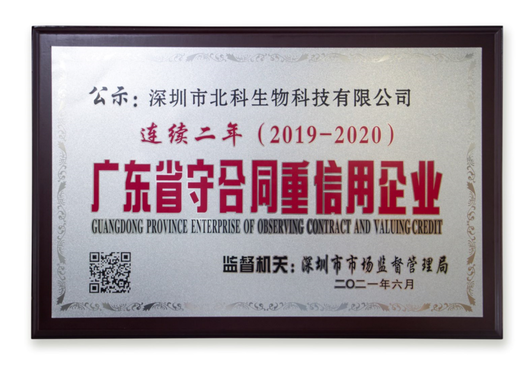 近日,廣東省市場監(jiān)督管理局公布了2020年度廣東省守合同重信用企業(yè)名單。深圳市北科生物科技有限公司順利通過最終評審,連續(xù)兩年榮獲“廣東省守合同重信用”榮譽稱號,并獲頒榮譽證牌匾和榮譽證書。
