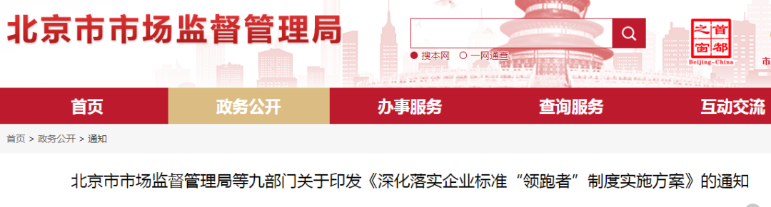 為落實《中共北京市委 北京市人民政府關(guān)于加快培育壯大新業(yè)態(tài)新模式促進(jìn)北京經(jīng)濟(jì)高質(zhì)量發(fā)展的若干意見》,按照《市場監(jiān)管總局等八部門關(guān)于實施企業(yè)標(biāo)準(zhǔn)“領(lǐng)跑者”制度的意見》要求,市市場監(jiān)管局等九部門制定了《深化落實企業(yè)標(biāo)準(zhǔn)“領(lǐng)跑者”制度實施方案》,經(jīng)市政府批準(zhǔn),現(xiàn)印發(fā)給你們。請認(rèn)真貫徹落實,鼓勵企業(yè)創(chuàng)制先進(jìn)標(biāo)準(zhǔn),促進(jìn)新業(yè)態(tài)新模式發(fā)展壯大,以高標(biāo)準(zhǔn)推動北京經(jīng)濟(jì)高質(zhì)量發(fā)展。