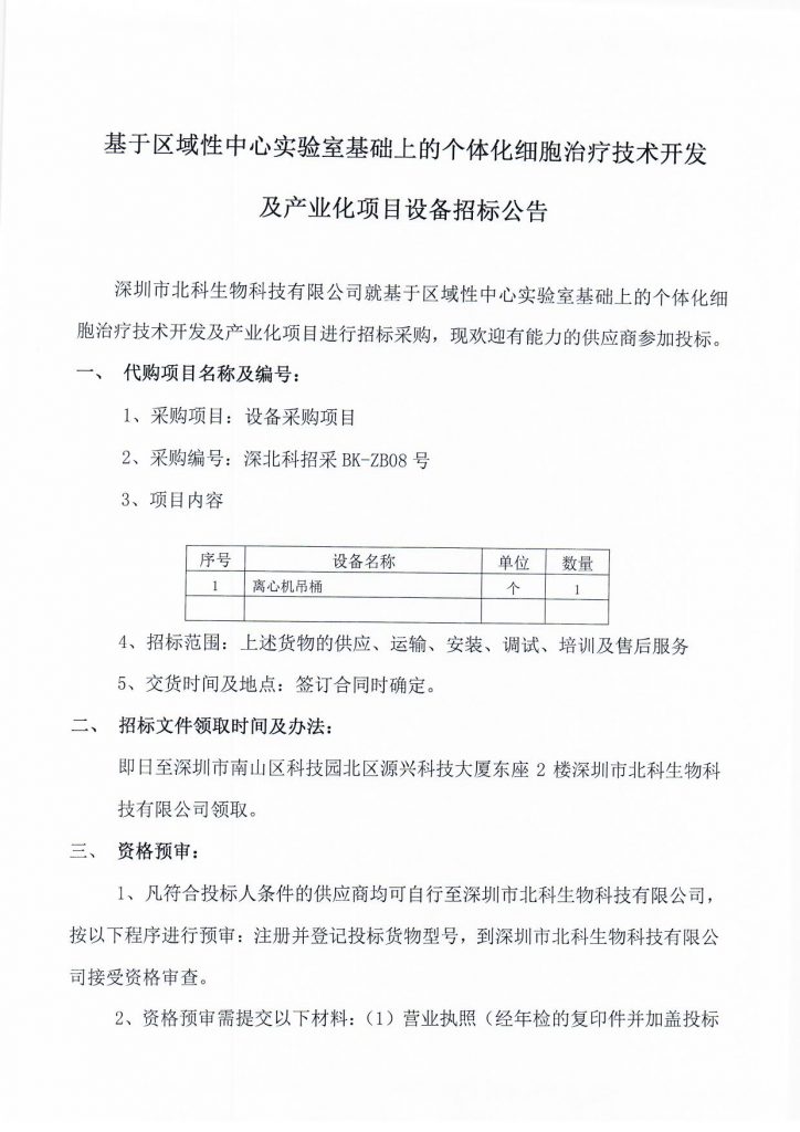基于區(qū)域性中心實驗室基礎(chǔ)上的個體化細胞治療技術(shù)開發(fā)及產(chǎn)業(yè)化項目設(shè)備招標公告