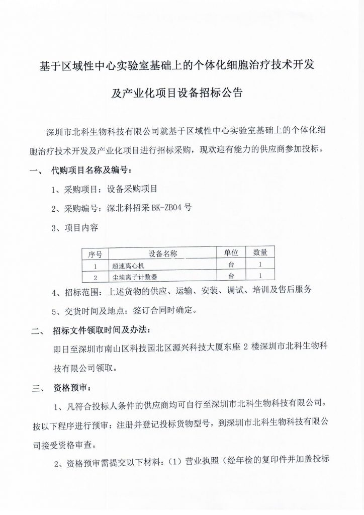 基于區(qū)域性中心實(shí)驗(yàn)室基礎(chǔ)上的個(gè)體化細(xì)胞治療技術(shù)開發(fā)及產(chǎn)業(yè)化項(xiàng)目設(shè)備招標(biāo)公告