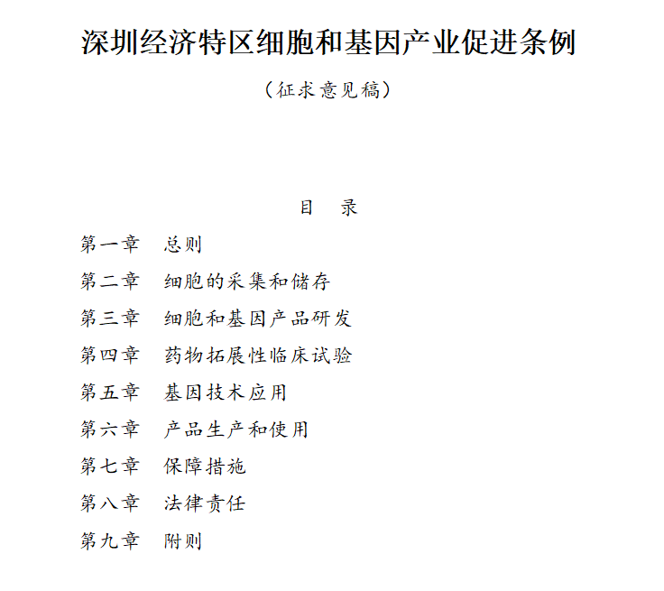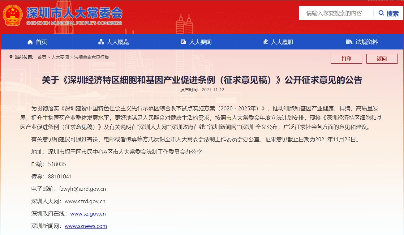 2021年11月12日,深圳新興領域重要立法《深圳經(jīng)濟特區(qū)細胞和基因產(chǎn)業(yè)促進條例(征求意見稿)》在深圳市人大常委會網(wǎng)站上公開征求意見。