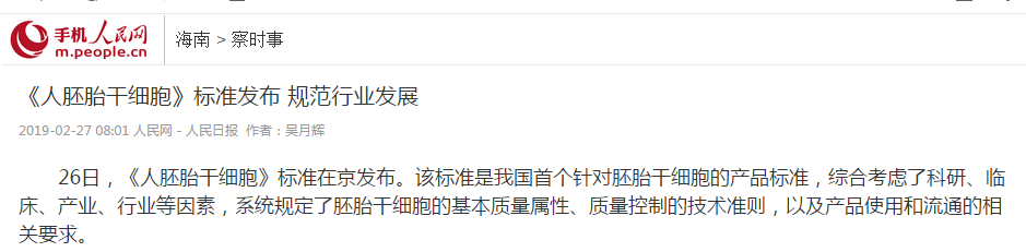 2019年2月26日,《人胚胎干細胞》標準在京發(fā)布。該標準是我國首個針對胚胎干細胞的產(chǎn)品標準,綜合考慮了科研、臨床、產(chǎn)業(yè)、行業(yè)等因素,系統(tǒng)規(guī)定了胚胎干細胞的基本質(zhì)量屬性、質(zhì)量控制的技術準則,以及產(chǎn)品使用和流通的相關要求。